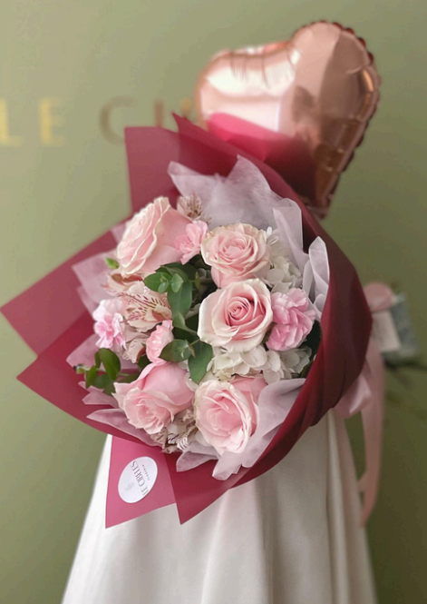 Exquisito boquet con un jardín de hortensias, rosas, claveles, astromelias y follaje.